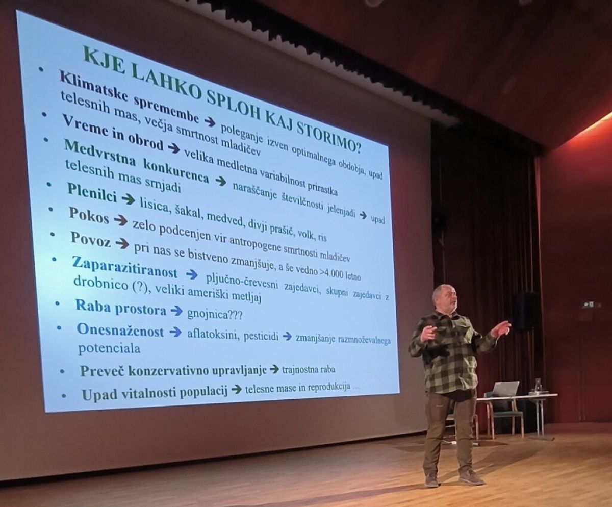 Pa je res glavni krivec šakal? Več kot 100 lovcev je pred dnevi na strokovnem predavanju v Pivki razpravljalo o vzrokih za upadanje številčnosti srnjadi v Sloveniji. Dogodek, ki sta ga organizirala komisija za upravljanje z divjadjo pri Postojnsko Bistriški zvezi lovskih družin (PBZLD) in Zavoda za turizem Pivka, je bil del študijskega krožka »Prostoživeče živalske vrste – opazovanje, sobivanje, ozaveščanje«. Predaval je Boštjan Pokorny, predsednik Strokovno-znanstvenega sveta Lovske zveze Slovenije, ki je predstavil vzroke za upad srnjadi, med katerimi šakal ni edini, ampak le del širše, kompleksne problematike.